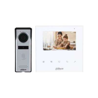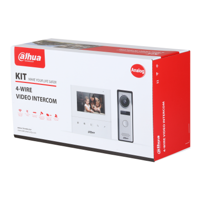DHI-KTA04 — компактный комплект аналогового видеодомофона для квартиры или частного дома, включающий 4.3" внутренний монитор DHI-VTH1010J и вызывную панель DHI-VTO1000J. Решение обеспечивает видеосвязь с посетителем, удалённое открытие замка и контроль входной зоны.